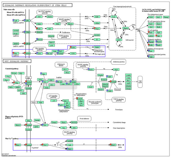 Wnt signaling pathway (mmu04310) maps and Signaling pathways regulating pluripotency of stem cells (mmu04550) derived from DAVID analysis. Green boxes and arrows indicate the genes and interactions in the pathway. +p and −p denote phosphorylation and dephosphorylation, respectively. The genes with red stars are those that were upregulated with nicotine treatment and downregulated with mecamylamine. Additionally, the genes with blue stars represent those that were upregulated in response to nicotine and not downregulated with mecamylamine treatment. The sub-pathways related to the canonical and non-canonical Wnt pathways are highlighted with a blue box.