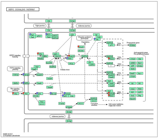 Hippo signaling pathway (mmu04390) maps derived from DAVID analysis. Green boxes and arrows indicate the genes and interactions in the pathway. +p and −p denote phosphorylation and dephosphorylation, respectively. The genes with red stars are those that were upregulated with nicotine treatment and downregulated with mecamylamine. Additionally, the genes with blue stars represent those that were upregulated by nicotine and not downregulated with mecamylamine treatment.
