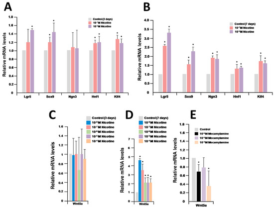 Relative quantification of marker genes and Wnt5a after treatment with nicotine and mecamylamine. (A,B) Relative quantification of marker genes after treatment with nicotine for three days and seven days; (C,D) relative quantification of Wnt5a after treatment with nicotine for three days and seven days; (E) relative quantification of Wnt5a after treatment with mecamylamine for seven days; (A–E) the results are based on three independent experiments and are expressed as mean values ± SD. An asterisk indicates a statistically significant difference from untreated control organoids (Student’s t-test, * p < 0.05).