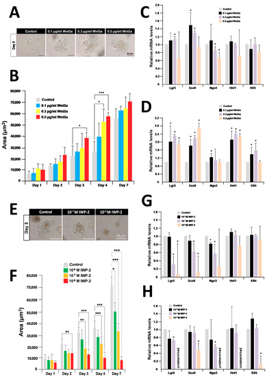 Effects of recombinant Wnt5a and IWP-2 on organoid growth and differentiation. (A) Micrographs of organoids after treatment with 0.1 μg/mL, 0.3 μg/mL, and 0.5 μg/mL recombinant Wnt5a for three days of culture; (B) effect of recombinant Wnt5a on the size of cultured organoids; (C) relative quantification of marker genes after treatment with recombinant Wnt5a for three days; (D) relative quantification of marker genes after treatment with recombinant Wnt5a for seven days; (E) micrographs of organoids after treatment with 10−7 M and 10−5 M IWP-2 for three days; (F) effect of IWP-2 on the size of cultured organoids; (G) relative quantification of marker genes after treatment with IWP-2 for three days; (H) relative quantification of marker genes after treatment with IWP-2 for seven days; (B,F) each sample represents an average of three independent experiments. Error bars represent the SD of the mean. An asterisk indicates a statistically significant difference from untreated control organoids (Mann–Whitney test, * p < 0.05, ** p < 0.005, and *** p < 0.0005). (C,D,G,H) The results are based on three independent experiments and expressed as mean values ± SD. An asterisk indicates a statistically significant difference from untreated control organoids (Student’s t-test, * p < 0.05).