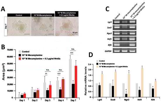 Rescue of organoid growth and differentiation after co-treatment with mecamylamine and recombinant Wnt5a. (A) Micrographs of organoids after treatment with 10−4 M mecamylamine and 10−4 M mecamylamine/Wnt5a for seven days; (B) effect of 10−4 M mecamylamine and 10−4 M mecamylamine/Wnt5a on the size of cultured organoids. Each sample represents an average of three independent experiments. Error bars represent the SD of the mean. An asterisk indicates a statistically significant difference from untreated control organoids (Mann–Whitney test, n.s., not significant, ** p < 0.005, and *** p < 0.0005). (C) Effect of 10−4 M mecamylamine and 10−4 M mecamylamine/Wnt5a on the expression of ISC markers and epithelium in a seven-day culture of organoids; (D) relative quantification of marker genes after treatment with 10−4 M mecamylamine and 10−4 M mecamylamine/Wnt5a for seven days. The results are based on three independent experiments and are expressed as mean values ± SD. An asterisk indicates a statistically significant difference from untreated control organoids (Student’s t-test, * p < 0.05).