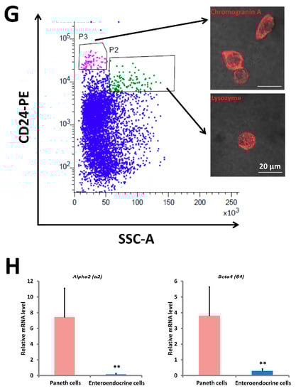Paneth cells have a stem cell niche function [33]. To determine if the α2/β4 nAChR subtype is localized in Paneth cells, we carried out double immunohistochemical staining using antibodies against α2 or β4, and the Paneth cell marker protein, lysozyme. As shown in Figure 9A–F, the α2 and β4 subunits co-localized with lysozyme. The results indicate that the α2/β4 nAChR subtype is localized in Paneth cells. In addition, we performed to isolate Paneth cells with a cell sorter using the mouse anti-CD24-PE antibody [33]. We obtained two types of cells, CD24 high/SSC high (P2) and CD24 high/SSC low (P3) cells, using fluorescence-activated cell sorting (FACS) (Figure 9G). Then, we examined immunostaining analysis to confirm each cell type. CD24 high/SSC low cells (P3) are positive for the enteroendocrine marker chromogranine A (Figure 9G, top right), whereas CD24 high/SSC high cells (P2) are positive for the Paneth marker lysozyme (Figure 9G, bottom right). We conclude that CD24 high/SSC low cells (P3) are enteroendocrine cells and CD24 high/SSC high cells (P2) are Paneth cells, respectively. In agreement with the immunostaining analysis, the transcripts of the α2 (Alpha2) and β4 (Beta4) were exclusively confirmed to be expressed in Paneth cells. The results also indicate that the genes encoding α2 (Alpha2) and β4 (Beta4) are selectively expressed in Paneth cells of organoids.