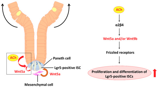 Our data suggest in part that the regulation of ISCs in normal adult mouse crypts is linked to upregulation of nAChR-driven Wnt expression. According to the model (Figure 10), endogenous ACh binds to the α2/β4 nAChR subtype in Paneth cells, and then induces Wnt5a and/or Wnt9b expression. The Wnts bind to various Frizzled receptors to activate Wnt signaling, and eventually proliferation and differentiation of Lgr5-positive ISCs are enhanced.