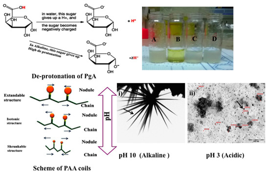 Poly (acrylic) acid (PAA) is a hydrophilic polymer [19], with random coils on its chains consisting of only thermal blobs. These coils have swelling properties under ionic and salt strength that lead to extend its chain in alkaline solution (e.g., see scheme of PAA coils) [20]. The extendable and shrinkable properties at alkaline and acidic pH (for example see Figure 1i,ii) are the main physical properties of PAA (e.g., see Figure 1i,ii) [20,21,22,23]. The reason of these properties is due to its hydrogel PAA compounds that can answer to pH changes [24,25,26]. In hydrated media of appropriate pH and ionic strength, the carboxylic groups develop and ionize fixed charges on the polymeric network, thus producing electrostatic repulsive forces that are responsible for pH-dependent swelling or de-swelling of the hydrogel structure [27,28].