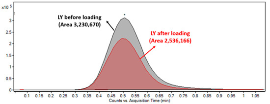 Measurement of LY2157299 (LY) encapsulated by mass spectrometry: overlapping chromatograms of EIC m/z 370.1664 before (black peak) and after (red peak) loading. The peak obtained after loading refers to LY concentration in the supernatant after centrifugation. *: LY concentration Peak in the supernatant; Y-axis: number of Counts.