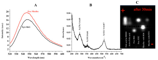The so fabricated micelles appeared to have spherical shapes, with diameters ranging from 100–200 nm. Their surfaces consist of many dark structures like spots (See Figure 3C (green arrows)). Also, micelles that were under formation have many dark spots collected together (see Figure 3C (red arrows)). This reveals that the internal and external structure of micelles consist of several collected spots having internal cross-linked structure. Topography of micelles refers to many small aggregated spots on surface (e.g., see Figure 3C,D). In agreement to previous reports [32,33], PAA is expected to form hydrophilic corona of PgA-PAA complex. In this case, the swelling of PAA polymer on water makes it favourable for protection because PAA adsorbs water many more times than its weight in alkaline pH [34]. The UV-Visible absorption spectrum indicated that the absorption peaks of folate-micelles at 278 and 355 nm are assigned to folate peaks (e.g., see Figure 4B). This confirms the covalent attachment of the folic acid according to previous reports [35]. However absorption peak at 523 nm reveals R6G conjugation. The successful attachment of PgA-R6G was investigated by using fluorescence spectrophotometry (see Figure 4A). Hence, the amino group of R6G is attached electrostatically by carboxylic group of PgA. This property was used for assembled micelles structure having fluorescence intensity at the same wavelength of PgA-R6G. Micelles moieties that are run on agarose gel showed strong attachment, even to 30 min., running under 60 V (e.g., Figure 4C). In this sense, R6G labeled micelles were separated more difficulty when compared to micelles that are labeled by Fluorescein isothiocyanate (FITC) (see Figure 4C).