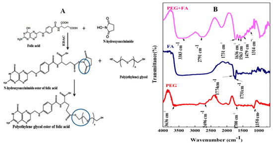 Folic acid conjugated with Poly (ethylene) glycol. (A) Scheme of FA-PEG conjugation; (B) FTIR spectra of PEG, PEG+FA, FA (arrows indicate selected bands).