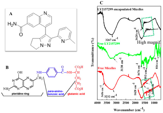Bands Modification of Encapsulated LY2157299. (A) LY215299 structure; (B) Folic acid structure; (C) FTIR spectra of LY/LYfree micelles and LY-loaded micelles (squared dotted lines refer to selected bands).