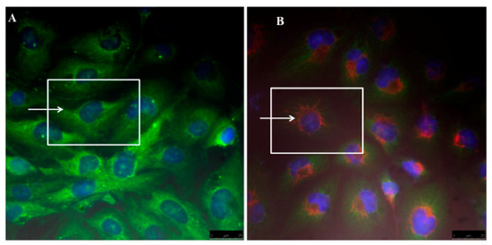 Confocal laser scanning fluorescence microscopy images of SMA (green) and Micelles (Red). (A) Control HLF (without LY-loaded micelles); (B) HLF incubated with encapsulated LY. (Scale bar: 25 µm) (Arrows and square indicate nanomicelles uptake).