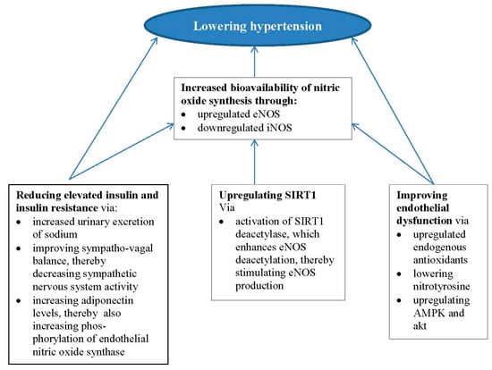 - Li, R.; Zhang, H.; Wang, W.; Wang, X.; Huang, Y.; Huang, C.; Gao, F. Vascular insulin resistance in prehypertensive rats: Role of PI3-kinase/Akt/eNOS signaling. Eur. J. Pharmacol. 2010, 628, 140–147. [Google Scholar] [CrossRef] [PubMed]