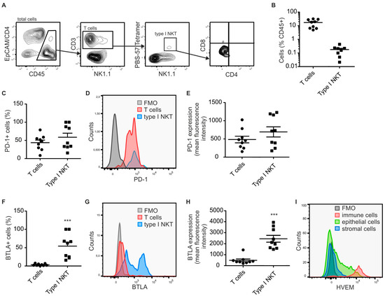 To analyze expression of immune checkpoint receptors on tumor-infiltrating lymphocytes, with a focus on NKT cells, we performed FACS analysis of single cell suspensions derived from murine PyMT mammary tumors at Week 18. The PyMT model is driven by the expression of the polyoma middle T oncoprotein in the mammary epithelium and recapitulates human HER2+ metastatic breast cancer [18]. At Week 18, PyMT tumors in C57BL/6 mice have usually progressed to a pre-metastatic state. To specifically identify type I NKT cells, PBS-57-loaded CD1d tetramers were used. As expected, type I NKT comprised a minor population of tumor infiltrating immune cells, whereas conventional T cells were highly abundant (Figure 1A,B). When analyzing expression of immune checkpoint receptors, type I NKT showed a very distinct pattern compared to conventional T cells. While expression of immune checkpoint receptors such as PD-1 (Figure 1C–E) was comparable, abundant expression of BTLA was only observed on type I NKT cells (Figure 1F–H). HVEM, the ligand of BTLA, was expressed at high levels on immune cells in PyMT-tumors and at lower variegated levels on tumor epithelial cells (Figure 1I), allowing the engagement of BTLA by several cells in the microenvironment of PyMT tumors.
