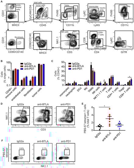 Anti-BTLA antibodies increase tumor infiltrating NKT cell numbers. PyMT tumors were treated with 5 mg/kg of each anti-BTLA, anti-PD-1 or isotype control (IgG2A) antibodies (n = 7 each) twice weekly for three weeks once the first tumor reached a size of 0.5 cm in diameter. Tumors were harvested for FACS analysis 21 days after initial treatment. (A) Representative FACS plots show gating strategy to identify cellular subsets in PyMT tumors. (B) The relative abundance of tumor cells, CD45+ immune cells, fibroblasts and endothelial cells in the total single cell population is shown. (C) The relative abundance of myeloid and lymphoid cell subsets within total CD45+ cells is displayed. (D,E) The graph indicates the relative abundance of PBS-57-CD1d tetramer reactive type I NKT cells. (F) Representative FACS plots indicate the expansion of PBS-57-CD1d tetramer reactive type I NKT cells upon anti-BTLA treatment. p-values were calculated using one-way ANOVA with Bonferroni’s correction, * p < 0.05.