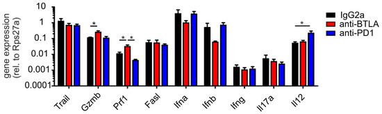 Anti-BTLA antibodies induce cytotoxic lymphocyte marker expression. PyMT tumors were treated with 5 mg/kg of each anti-BTLA, anti-PD-1 or isotype control (IgG2A) antibodies (n = 7 each) twice weekly for three weeks once the first tumor reached a size of 0.5 cm in diameter. Tumors were harvested for quantitative PCR analysis 21 days after initial treatment. The expression of the indicated genes relative to the house-keeping gene Rps27a is displayed. p-values were calculated using one-way ANOVA with Bonferroni’s correction, * p < 0.05.