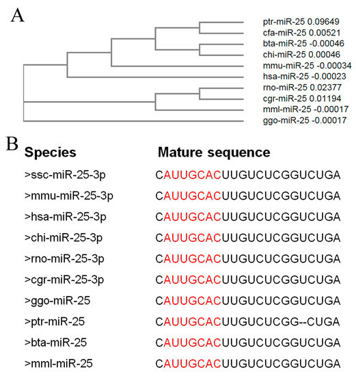 Clustal Omega (Available online: https://www.ebi.ac.uk/Tools/msa/clustalo/) [14] was used to build the phylogenetic tree of pre-miRNA of miR-25. The results show that compared with other species selected in this study, the genetic relationship between mice and humans, cattle and goats, and gorillas and rhesus monkeys is closer (Figure 1A). The mature sequences of miR-25 are highly conserved in mammals, including pigs, mice, humans, goats, rats, hamsters, gorillas, chimpanzees, cattle, and rhesus monkeys. The “seed” sequences of miR-25 are identical, although there is a base deletion at the end of the chimpanzee sequence (ptr) (Figure 1B).