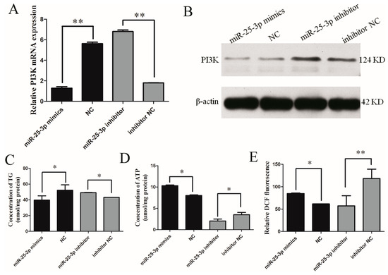The effect of miR-25 on the metabolism of C2C12 cells. miR-25-3p mimics/NC or inhibitors/NC were respectively transfected into growing C2C12 cells. After 48 h, PI3K expression was detected by qRT-PCR (A) and Western blotting (B). After 24–48 h transfection, the levels of triglyceride (TG) (C), ATP (D), and reactive oxygen species (ROS) (E) were measured with commercial kits. The fluorescence of DCF represents the content of ROS. NC = negative control (miR-239b-5p of caenorhabditis elegans). β-actin served as the loading control. Data were presented as means ± SD (n ≥ 3); * p < 0.05; ** p < 0.01.