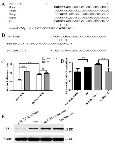 miR-25-3p directly targets the 3′UTR of Akt1. (A) The sequences of miR-25-3p target elements in the Akt1 3′UTR were relatively conserved in many mammals. These sequences were obtained from TargetScan. (B) Site-directed mutagenesis of the miR-25-3p target site in the Akt1 3′UTR; mutated bases shown in red. (C) Dual luciferase reporter assay. The Akt1 3′UTR/mutant plasmid was cotransfected with miR-25-3p mimics/NC, respectively, into growing C2C12 cells; dual luciferase activities were measured from cell lysates (24 h after transfection). miR-25-3p mimics/NC or inhibitors/NC were respectively transfected into growing C2C12 cells. After 48 h, Akt1 expression was detected by qRT-PCR (D) and Western blotting (E). NC = negative control (miR-239b-5p of caenorhabditis elegans). β-actin served as the loading control. Data were presented as means ± SD (n ≥ 3). ** p < 0.01; NS, not significant.