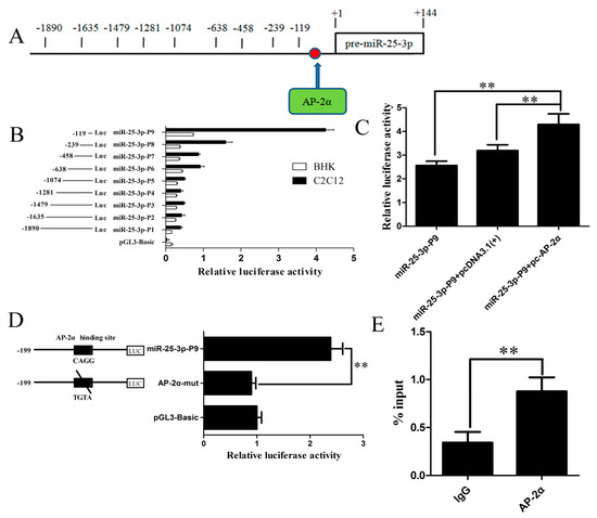 Transcription factor AP-2α binds to the miR-25-3p promoter region. (A) Schematic diagram of the AP-2α binding site (arrow, red dot) in the miR-25-3p promoter. The first nucleotide of pre-miR-25-3p was assigned as +1, and the other nucleotides were numbered relative to it. (B) A series of progressive deletion mutants were transfected into growing BHK and C2C12 cells, and the promoter activities were analyzed by dual luciferase activity assay. (C) miR-25-3p-P9 reporter constructs were cotransfected with pc-AP-2α into growing C2C12 cells. Dual luciferase activity was measured 24 h after transfection. Overexpression of AP-2α upregulated miR-25-3p promoter luciferase activity. pcDNA-3.1(+) was used as a control. (D) Site-directed mutagenesis of the AP-2α binding site (CAGG into TGTA) in the miR-25-3p promoter region resulted in the miR-25-3p-P9 luciferase activity being reduced. Data were expressed as the ratio of relative activity, normalized to pRL-TK, and presented as means ± SD (n ≥ 3). (E) Binding of AP-2α to the miR-25-3p promoter region was analyzed by chromatin immunoprecipitation (ChIP). DNA isolated from immunoprecipitated materials was amplified using qRT-PCR. Normal mouse IgG was used as the negative control. Data were normalized by total chromatin (input) and presented as means ± SD (n = 3); ** p < 0.01.