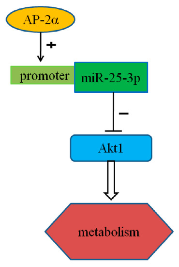 Representation of the proposed mechanism. miR-25-3p is regulated by transcription factor AP-2α, and contributes to C2C12 metabolism by targeting Akt1. The arrow-head and “+” represent activation while the blunt-head and “−“ represent suppression.