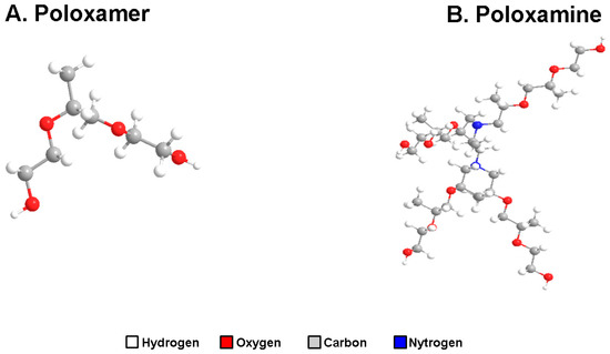 Structure of poloxamers (A) and poloxamines (B). Two-dimensional sequences of Poloxamer P85 (CID: 10145203) and poloxamine 304 (CID: 86278173) were obtained from PubChem. Three-dimensional (3D) structures of the different compounds were drawn with ChemBioOffice 2012 (Chem3D Pro 13; PerkinElmer Informatics, Cambrigde, MA, USA).