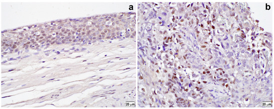 Immunohistochemistry of p-ELK1 in normal urothelial tissue (a) and urothelial tumor (b). A semi-quantitative analysis of p-ELK1 expression is performed by employing a combination of staining intensity (i.e., weak (a), strong (b)) and distribution (i.e., percentage of immunoreactive cells). Original magnification: 400×.