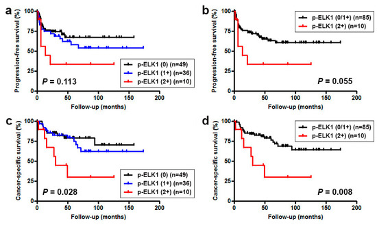 Next, we investigated possible associations between p-ELK1 expression and patient outcomes. To more accurately assess the role of p-ELK1 expression in disease progression, those with M1 disease (n = 4) at the time of nephroureterectomy were excluded from the analyses. Kaplan-Meier and log-rank tests revealed no significant associations between p-ELK1 levels and tumor recurrence in the bladder (0 vs. 1+/2+, P = 0.458; 0/1+ vs. 2+, P = 0.806). By contrast, moderate p-ELK1 expression was marginally or significantly associated with lower progression-free survival (PFS) (0/1+ vs. 2+, P = 0.055; Figure 2a,b), overall survival (OS) (0/1+ vs. 2+, P = 0.020; figure not shown), and cancer-specific survival (CSS) (0/1+ vs. 2+, P = 0.008; Figure 2c,d) rates. Significant differences in the prognosis were still seen in 81 cases of high-grade tumors (PFS: P = 0.042; OS: P = 0.022; CSS: P = 0.013), but not in 58 cases of muscle-invasive tumors (PFS: P = 0.411; OS: P = 0.163; CSS: P = 0.135).