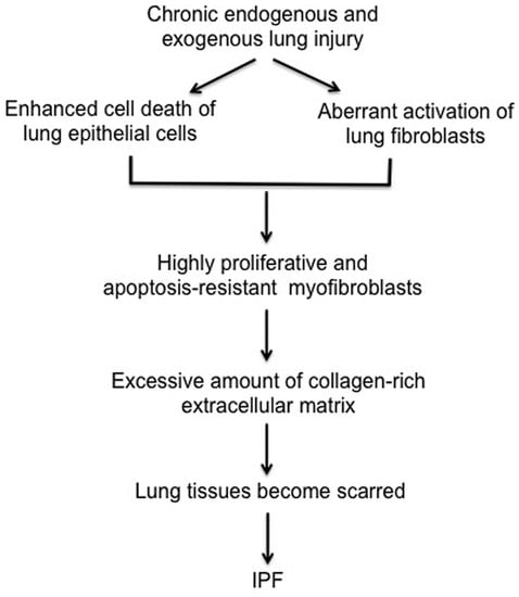 IPF is the most common type of idiopathic interstitial pneumonia and it is the prototypical chronic, progressive, and almost uniformly fatal fibroproliferative lung disease. IPF is estimated to occur with similar frequency to cancers of the stomach, brain and testicles, although true incidence is difficult to capture [,,]. Patients with IPF have a characteristic “usual” interstitial pneumonia (UIP) pattern characterized by progressive scarring of lungs []. While pirfenidone and nintedanib were both approved by the Food and Drug Administration (FDA) to treat IPF, they help to reduce clinical exacerbations that affect pulmonary function and do not represent curative approaches [,]. IPF is a multifactorial disease that likely results from complex interactions between genetic and environmental factors [,]. Although the precise underlying mechanisms that underlie the development of IPF are not understood, a growing number of studies suggest that IPF is initiated by endogenous or exogenous lung epithelial injury (Figure 1). There are two different types of lung epithelial cells, type I and type II pneumocytes in human lung. Type I pneumocytes cover approximately 95% of lung epithelium and play a crucial role in gas exchange. Although type II pneumocytes account for small portion of the cell population, they function as progenitor cells to repair damaged lung epithelium. Lung injury can occur via several mechanisms, as it is exposed to many exogenous and endogenous insults. Under normal physiological conditions, a coordinated sequence of events triggered by growth factors and cytokines, such as TGF-β, IL-6 and IL-1β that are produced during the repair process to recruit immune cells. During this process, fibroblasts become activated to myofibroblasts and produce type I collagen-rich ECM to help repair lung epithelium. Following proper repair, fibroblasts then undergo apoptosis to maintain homeostasis. In fibroproliferative diseases, this repair process is disrupted, resulting in aberrant repair, which may contribute to chronic lung fibrosis. Studies suggest that chronic exposure to environmental factors such as cigarette smoke and environmental toxins is closely associated with the development of IPF [,,]. Transforming growth factor beta (TGF-β) is a particularly well-characterized pro-fibrotic growth factor produced during lung injury. In vitro assays have clearly demonstrated that TGF-β activates fibroblasts to become myofibroblasts, leading to production of the type I collagen ECM [,]. The current working hypothesis is that IPF results following aberrant wound healing from an unknown and chronic lung insult that increases the production and/or activity of TGF-β and other pro-fibrotic cytokines that encourage the relentless production of type I collagen-rich ECM via (myo)fibroblast activation. This aberrant lung tissue repair process subsequently promotes the emergence of proliferative and apoptosis-resistant fibrotic fibroblasts. Eventually, collagen-rich ECM produced by these fibrotic fibroblasts distorts lung epithelium, severely disrupting normal gas exchange.