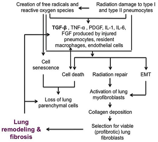 Ionizing radiation induces a complex series of injuries mediated by oxidative stress, cell death or senescence and loss of normal lung barrier functions (Figure 2) []. Radiation injury initially injures type I pneumocytes lining the alveoli but is followed by disruption of type II pneumocytes, which secrete surfactant to prevent alveolar collapse at expiration and serve as precursors for type I pneumocytes [,]. Injured pneumocytes, resident macrophages and/or endothelial cells that line alveoli stimulate release of inflammatory cytokines such as TGF-β, tumor necrosis factor-alpha (TNF-α), platelet derived growth factor (PDGF), interleukin (IL)-1 and IL-6, as well as fibroblast growth factor (FGF) [,,,,]. Similar to its pro-fibrotic role in IPF, TGF-β is a powerful central mediator of early and late lung radiation injury response, serving to activate fibroblasts and perpetuate the fibrotic cascade. Activated (myo)fibroblasts at the injured site then produce collagen-rich ECM proteins during repair of basement membranes. During normal healing, alveolar–capillary permeability is repaired and inflammation resolves. Following radiation injury to lung, inappropriate activation of myofibroblasts can result in tissue remodeling and excessive extracellular matrix deposition [,,,]. Some alveolar epithelial cells can also undergo transdifferentiation into myofibroblasts through epithelial-to-mesenchymal transition (EMT). EMT is controlled by transcriptional factors such as Snail and Twist, and the activation of these proteins represses E-cadherin and increases contractile protein α-smooth muscle actin (α-SMA) [,,,]. It is likely that this combination of continued myofibroblast activation, collagen deposition, EMT and persistent inflammatory cytokine signaling leads to fibrosis. As in IPF, collagen that is predominantly produced by fibroblasts, is the most abundant matrix within fibrotic lesions. It is also well recognized that collagen metabolism is frequently deregulated in neoplastic disease, contributing to an altered ECM [,]. Like IPF fibroblasts, cancer-associated fibroblasts present within tumor microenvironment also play a significant role in disease progression and are a clear target for treatment [,]. While the focus of this review is on the mechanisms of pulmonary fibrosis, there are several excellent reviews that examine the role of cancer-associated fibroblasts in modulating the tumor microenvironment [,,,].