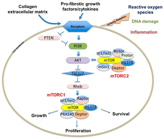Tumor cells generally possess impaired DNA repair capabilities than normal cells, thus making them more susceptible to radiation-induced DNA damage [,]. This supports the observation that mTOR signaling and inhibition induces differential responses on tumor cell repair compared to normal cell repair. In one study evaluating the effect of radiation on hair follicle transit amplifying cells, radiation induced mTORC1 activation until full regeneration of the hair follicle was complete []. Moreover, inhibiting mTORC1 by rapamycin increased radiation-induced cell apoptosis and reduced cell proliferation, leading to hair loss in the irradiated mice. Results suggest that mTORC1 is necessary for efficient repair of injured hair follicles to occur following radiation []. Pathologic fibrotic lung fibroblasts obtained from patients with IPF resist stress-induced apoptosis through abnormally high PI3K/AKT/mTOR activation that results from PTEN suppression [,,]. High mTORC1 and mTORC2 activity may therefore translate to improved DNA repair, permitting survival and proliferation of fibroblasts that favor and encourage fibrosis. As these pathologic fibroblasts have altered cell signaling, mTOR inhibitors may increase fibroblast cytotoxicity following radiation, thus mitigating fibrosis. Indeed, in a murine model of radiation-induced pulmonary fibrosis, rapamycin treatment following coarse-fractionated thoracic radiation reduced lung collagen accumulation compared to irradiated control mice that did not receive rapamycin [].