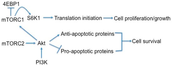 mTOR regulates cell growth, proliferation, and survival. The arrows indicates positive regulation while the symbol T indicates the inhibition of the target molecule(s).