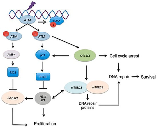 Cellular consequences of radiation are variable and depend on multiple factors. Simplistically, radiation induces both single strand and double-strand DNA damage, which triggers the DNA damage response pathway. Following activation of the damage response, cell cycle checkpoints are triggered to halt cell cycle progression to allow repair or initiation of cell death or senescence [,]. Ataxia telangiectasia mutated (ATM) protein, the primary regulator of the DNA damage response following ionizing radiation, phosphorylates target proteins involved in the cell cycle, DNA repair, apoptosis and senescence that ultimately signal the cell to undergo DNA repair, cell death or senescence [].