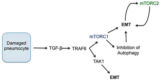 There is likely a complex relationship between lung injury, chronic inflammatory signaling and EMT. EMT has been shown to contribute to collagen-producing fibroblasts in experimental models of pulmonary fibrosis [,,]. TGF-β1 is crucial in the transdifferentiation of epithelial cells into cells with fibroblast or myofibroblast properties, a process that contributes to fibroproliferative disease (Figure 7) [,,]. Several studies have highlighted that injured lung epithelial cells are an important source of TGF-β, which induces the expression of αvβ6 integrin to further increase activated TGF-β locally [,]. This upregulated and sustained local TGF-β production in injured lung may drive differentiation of neighboring cells into collagen-producing pathologic fibroblasts, further contributing to lung fibrosis. Notably, TRAF6 has been shown to be essential in the non-canonical TGF-β signaling pathway and in one study, was required for TGF-β-induced EMT []. TRAF6 also activates and helps regulate mTORC1 activation, modulating autophagy [].
