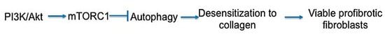 IPF is an age-associated disease. There is a progressive reduction of biological functions and resistance to multiple stressors during the aging process. Moreover, while aging is associated with IPF, aging-dependent autophagy alteration is also likely linked to IPF []. AKT activity is abnormally high in IPF fibroblasts derived from elderly patients, supporting that mTOR-dependent autophagy is also likely altered (Figure 8). Of note, autophagy was not induced in IPF biospecimens and primary IPF fibroblasts in two separate studies [,,]. When IPF fibroblasts are cultured on collagen, autophagy is low as a result of activation of mTOR, while normal lung fibroblast attachment to collagen increases autophagy due to suppression of mTOR activity [,]. IPF fibroblasts demonstrate relatively reduced LC3B-II expression, a marker of autophagy, in response to stressful conditions when compared to age-matched control fibroblasts [,]. This alteration affects fibrotic IPF fibroblast proliferation and viability, and mTOR inhibition greatly sensitized IPF fibroblasts that autophagy was re-activated to collagen-induced cell death. It is thought that normal lung fibroblasts view type I collagen as a stressful, apoptosis-triggering environment while IPF fibroblasts are desensitized to collagen. Thus, these findings indicate that the desensitization of IPF fibroblasts to an unfavorable environment is an important concept that may explain IPF pathogenesis. Inappropriately high mTOR activity may alter autophagic activity to help IPF fibroblasts or other fibrotic fibroblasts maintain an apoptosis-resistant phenotype despite a stressful microenvironment.