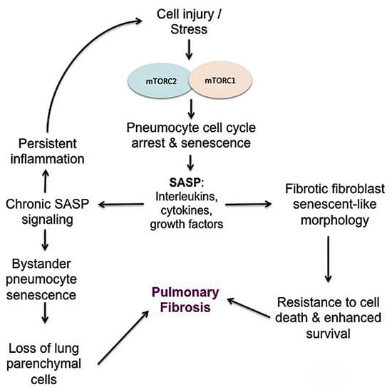 Proposed interaction between mTOR and the induction of SASP signals. Senescent pneumocytes may contribute to pro-inflammatory and pro-fibrotic signals, which further contribute to the development of pulmonary fibrosis through the loss of parenchymal cells and selection for improved fibroblast survival.