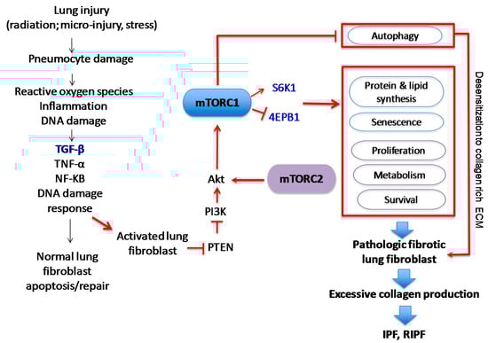 Fibroproliferative disease refers to diseased states characterized by the overabundance of newly formed fibrous tissue produced by connective tissue cells. It is estimated that 45% of deaths in the United States are secondary to fibroproliferative disease [,]. While atherosclerosis is the most commonly recognized fibroproliferative disease, less common fibrotic diseases such as idiopathic pulmonary fibrosis (IPF) and radiation-induced fibrosis are also associated with high morbidity and mortality []. Unlike in normal wound healing, fibrotic cells proliferate long after an initial causative factor and often create an insidious disease process. Lung is a vital organ required for normal gas exchange, and its normal physiologic function depends on the presence of a thin alveolar membrane. The continued deposition of collagen-containing extracellular matrix (ECM) around alveolar not only impairs gas exchange but can also collapse the normal alveoli and replace underlying parenchymal cells. Lungs exposed to various endogenous and exogenous stimuli that induce injury can therefore lead to fibroproliferative disease if aberrant wound healing results in excessive fibroblast proliferation and matrix production. The causative mechanisms that induce fibroproliferative disease within the lung may often be diverse, however these diseases share a common pathogenesis of uncontrolled and progressive fibrosis that negatively impact lung compliance and gas exchange, which can ultimately lead to respiratory compromise. Idiopathic pulmonary fibrosis (IPF) and radiation-induced pulmonary fibrosis (RIPF) are both characterized by slowly progressive fibrotic foci that involve inappropriately activated (myo)fibroblasts that are responsible for encouraging fibrosis []. Pulmonary fibrosis represents a significant challenge and there are no effective cures for fibrosis, highlighting that the lack of effective therapy represents a significant unmet clinical need [,]. One challenge in determining effective treatment relates to the fact that fibrosis is typically a chronic, prolonged disease process and there is an incomplete understanding of underlying pathological mechanisms. Recent evidence has suggested that mammalian target of rapamycin (mTOR)-dependent pathways may play an integral role in promoting both IPF and RIPF. Moreover, IPF patients are at high risk for the development of lung carcinoma, for which radiation is often used as primary or adjuvant treatment [,,,]. Here, we examine the pathophysiological functions of mTOR in promoting IPF and RIPF and discuss potential implications of targeting mTOR in the management of fibrosis.