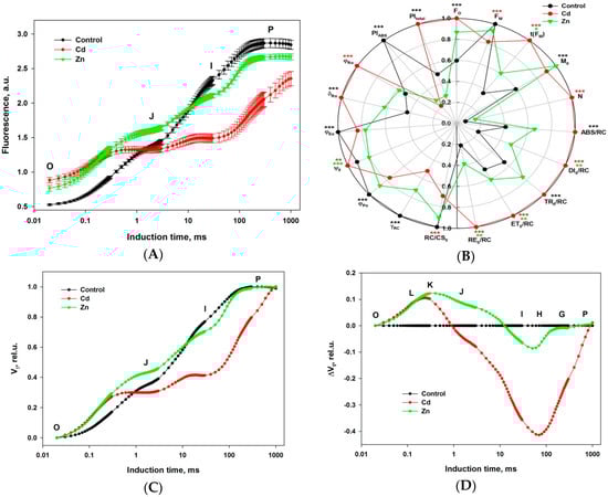 To describe the responses of the wheat photosynthetic apparatus to Cd- and Zn-exposure, we used the analysis of the photoinduced induction transients of chlorophyll fluorescence [,,]. The dynamics of the chlorophyll fluorescence rise are directly related to redox reactions not only in PSII, but throughout the entire photosynthetic electron transport chain. The application of the JIP test [] allows analysis of the changes in important energetic characteristics of the PSA as well as the stress-induced processes in the light phase of photosynthesis under in vivo conditions (Table 3).
