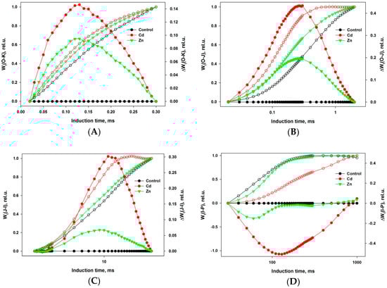 Combined graphs of differential curves (filled circles) and their corresponding double normalized chlorophyll fluorescence signal (empty circles): (A) from O to K (L band), (B) from O to J (K band), (C) from J to I (H), and (D) from I to P (G band). All these transients are constructed from the corresponding values of the curves shown in Figure 1A and the series designation is the same: control plants (black), exposed to Cd (red), and to Zn (green). There is a statistically significant difference for the maximal values of the differential curves of exposed plants compared to the control with p < 0.05.