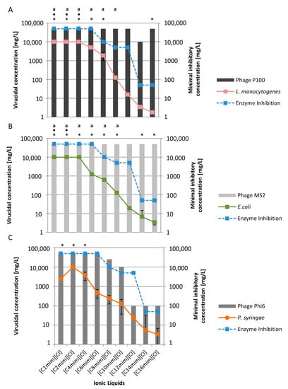 Virucidal concentration of imidazolium ionic liquids with increasing side chain length and the respective standard deviation using virus P100 (A); MS2 (B) and Phi6 (C) and the corresponding minimal inhibitory concentration of the host bacteria L. monocytogenes (A), E. coli (B) and P. syringae (C) and enzyme inhibition (blue line). (*) No virucidal effect was observed at a concentration of 50,000 mg/L. (•) No bactericidal effect was observed at a concentration of 10,000 mg/L. (a) calculation based on data of Fister et al. [].