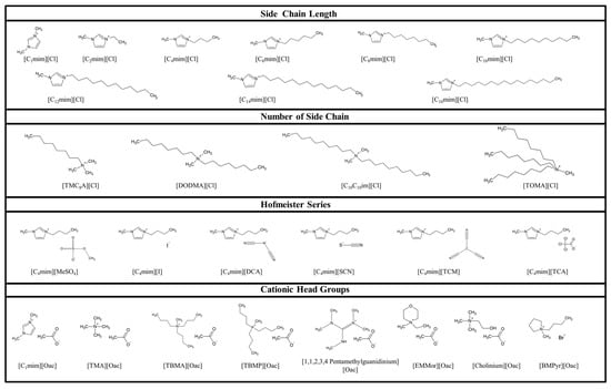 Structure of the 27 tested ILs, arranged according to their investigated structural characteristics.