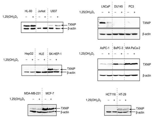 2.1. 1,25(OH)2D3 Induces, Reduces and Has No Effect on TXNIP Levels in Cancer Cells of Different Tissue Origins