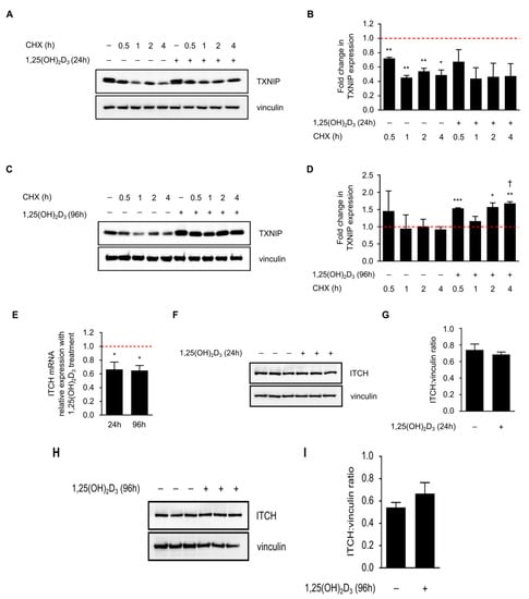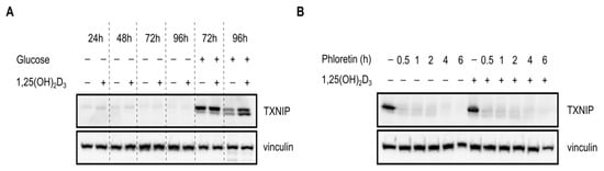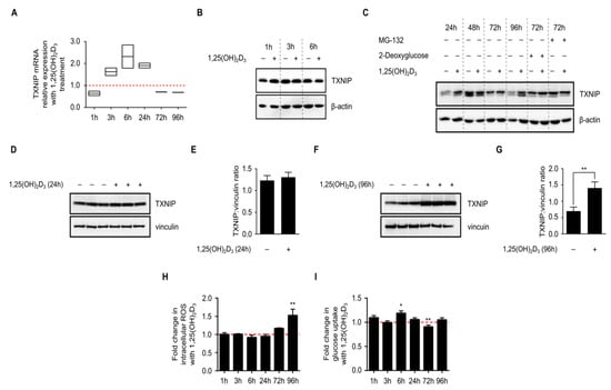 2.2. 1,25(OH)2D3 Transiently Induces TXNIP mRNA Levels but Increases Protein Levels in Long-Term Treatments