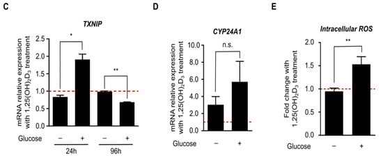 2.3. Glucose Availability Is Crucial for 1,25(OH)2D3-Mediated Regulation of TXNIP mRNA and Protein Levels as Well as Associated Oxidative Stress