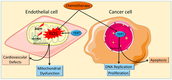 Differing role of telomerase within chemotherapeutic induced cellular damage (endothelial/cancer cells) and interconnectedness with cardiovascular disease. Cancer cells are the primary targets of a wide array of chemotherapeutic agents and often contribute to the forced apoptosis of cancerous cells. Separate from its emerging role as a protective element in the mitochondria, TERT functions to regulate DNA replication and proliferation in the nucleus.