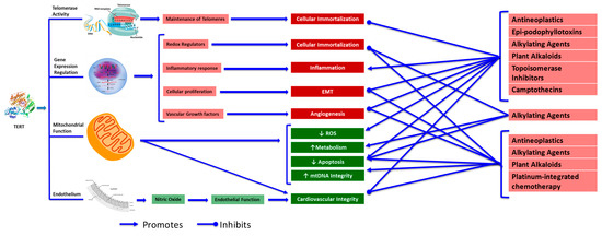 Hypothesized therapeutic nature of telomerase to preserve mitochondrial and endothelial function, therefore mitigating cardiovascular disease phenotypes, distinct from its previously detailed oncogenic role (gene expression regulation/telomere maintenance). TERT is known to control telomerase activity as well as regulate gene expression. Through its role in regulating telomere length, connection with the inflammatory response, cellular proliferation and vascular growth factors, telomerase has been shown to contribute to cellular transformation, inflammation, epithelial-mesenchymal transition (EMT) and angiogenesis. Due to these apparent connections with cellular proliferation and transformation, conventional wisdom has characterized TERT as an oncogene. Interestingly, recent evidence has emerged which presents a revolutionary therapeutic nature of telomerase in regard to preserving mitochondrial function as well as maintaining endothelial integrity through restoration of nitric oxide-mediated vasodilation and preserving endothelial function. This interconnectedness suggests the therapeutic nature of telomerase in relation to maintaining cardiovascular integrity. Specifically, telomerase has been shown to ameliorate excess ROS production, regulate metabolism, maintain conventional apoptotic function and preserve mtDNA integrity. Each beneficial component relates directly to various types of chemotherapeutic agents, which have been shown to be characterized by and include such damage, therefore proposing a role of telomerase to counter chemotherapeutic-derived cardiovascular dysfunction.