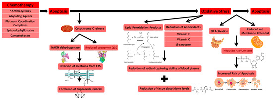 The administration of antineoplastic drugs is found to elevate oxidative stress levels in many types of cells [79]. Interestingly, a majority of antineoplastic agents increase oxidative stress as they promote apoptosis in cancer cells and serve as a mechanism for cardiac toxicity [80]. The induction of apoptosis results in elevated oxidative stress as one of its pathways involves cytochrome c release from the mitochondria. Release of cytochrome c diverts electrons from the electron transport system to oxygen by NADH dehydrogenase and reduced coenzyme Q10, ultimately resulting in the formation of superoxide radicals [78]. Additionally, increased oxidative stress stems from the increase of lipid peroxidation products, a diminution of the radical capturing ability of blood plasma due to the reduction of antioxidants (vitamin E, vitamin C, and β-carotene) within plasma, and the reduction of tissue glutathione levels [81]. Common agents that are known to generate high levels of ROS are anthracyclines, alkylating agents, platinum coordination complexes, epi-podophyllotoxins, and camptothecins [82], with anthracyclines known to generate the most oxidative stress on the vascular system [83]. As an example, Rtibi et al. show that treatment of Vinblastine, an anthracycline agent, induces gastrointestinal disruptions which are directly related to increased levels of oxidative stress and damage of various intracellular mediators [84]. Following administration of Vinblastine, intestinal tissues from treated rats showed significant increases in lipoperoxidation and H2O2 production along with a decrease of both enzymatic (catalase, glutathione peroxidase, superoxide dismutase) as well as non-enzymatic antioxidants (vitamin E, vitamin C, glutathione constituents) and disruption of intracellular iron and calcium levels. The ability of anthracyclines to augment oxidative stress levels stems from their capability to generate superoxide radicals as well as increase ROS by redirecting electrons away from the electron transport system within cardiac mitochondria [82].