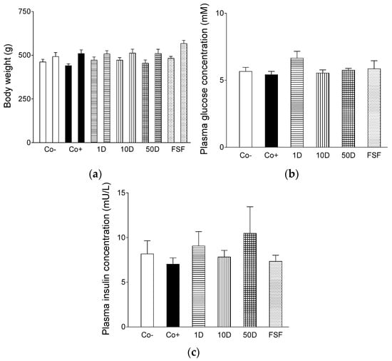 The effect of high-fat, high-sugar diet (HFHSD) (positive control: Co+), 2 g/kg bw/day fenugreek seed flour in addition to HFHSD (FSF), 1, 10 and 50 mg/kg bw/day diosgenin in addition to HFHSD (1D, 10D and 50D, respectively) on the body weight (a), fasting plasma glucose level (b) and fasting plasma insulin level (c) of Wistar rats. The negative control group (Co−) consisted of rats receiving conventional rat food and tap water. In the panel (a), the left one of columns with the same color and pattern indicates the initial body weight, while the right one shows the body weight after the 6-week dietary treatment. The columns represent the average values of the given groups (+SEM).