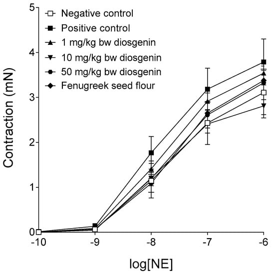 The maximal contractile forces that evolved in the presence of the different NE concentrations did not differ significantly among the six groups (Figure 2). The statistically non-significant increase in the NE-susceptibility of the positive control group (subjected to HFHSD only) might indicate a moderate decrease in the basal production and/or availability of NO in comparison with that/those of the negative control group (encompassing rats kept conventionally). If that were the case, the applied alimentary fenugreek and diosgenin treatments might slightly improve vascular NO homeostasis (Figure 2).
