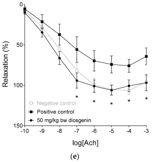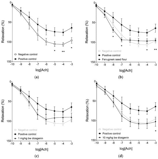 The effect of acetylcholine (Ach) on the abdominal aorta isolated from rats treated with dietary fenugreek seed flour (panel (b) or different doses of diosgenin in addition to high-fat, high-sugar diet (HFHSD) (panel (c–e)), and from rats forming the positive (receiving HFHSD only) and negative (receiving conventional rat food and tap water) controls (panel (a)). All aortic rings underwent a pre-contraction evoked by norepinephrine (NE) before the administration of Ach. The axis x shows the common logarithm of molar concentration of Ach, while the axis y indicates the effect as a percentage decrease of the initial contractile force of aortic rings. The symbols represent the effect of Ach averaged within the groups (±SEM). Asterisks denote the significance level of differences between groups indicated with black colored symbols and lines (*: p < 0.05; **: p < 0.01).