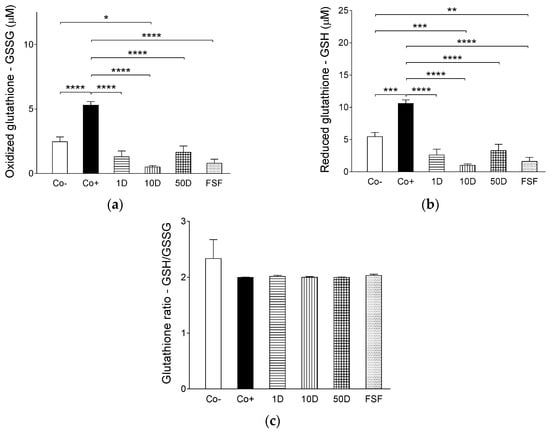 The effect of high-fat, high-sugar diet (HFHSD) (positive control: Co+), 2 g/kg bw/day fenugreek seed flour in addition to HFHSD (FSF), 1, 10 and 50 mg/kg bw/day diosgenin in addition to HFHSD (1D, 10D and 50D, respectively) on plasma levels of the oxidized (a) and reduced (b) forms of glutathione, furthermore on the ratio of reduced to oxidized glutathione (c) in Wistar rats. The negative control group (Co−) consisted of rats receiving conventional rat food and tap water. The columns represent the average values of the given groups (+SEM). Asterisks indicate the significance level of differences between groups (*: p < 0.05; **: p < 0.01; ***: p < 0.001; ****: p < 0.0001).