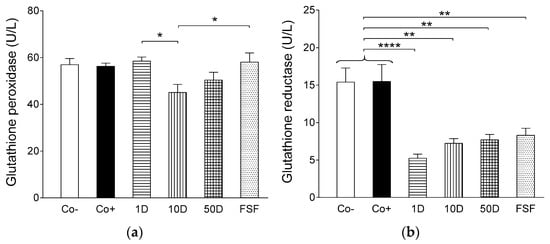 The effect of high-fat, high-sugar diet (HFHSD) (positive control: Co+), 2 g/kg bw/day fenugreek seed flour in addition to HFHSD (FSF), 1, 10 and 50 mg/kg bw/day diosgenin in addition to HFHSD (1D, 10D and 50D, respectively) on plasma activities of two major glutathione-handling enzymes, glutathione peroxidase (a) and glutathione reductase (b), in Wistar rats. The negative control group (Co−) consisted of rats receiving conventional diet. The columns represent the average values of the given groups (+SEM). Asterisks indicate the significance level of differences between groups (*: p <0.05; **: p < 0.01; ****: p < 0.0001).