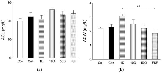 The effect of high-fat, high-sugar diet (HFHSD) (positive control: Co+), 2 g/kg bw/day fenugreek seed flour in addition to HFHSD (FSF), 1, 10 and 50 mg/kg bw/day diosgenin in addition to HFHSD (1D, 10D and 50D, respectively) on the antioxidant capacity of lipid- (ACL; (a)) and water-soluble (ACW; (b)) substances of blood in Wistar rats. The negative control group (Co−) consisted of rats receiving conventional rat food and tap water. The columns show the average values of the given groups (+SEM). Asterisks denote the significance level of differences between groups (**: p < 0.01).